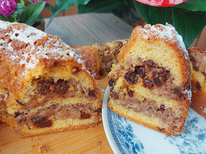 Jabuke izrendati dodati po želji šećera da malo odstoje pa ih iscediti ili im dodajte 1 kašiku griza da upije tečnost. Dodajte u jabude cimeta i suvo groždje. Kuglof podmažite i pospite brašnom ili obložite folijom. Testo podelite na tri dela a jabuke na dva.